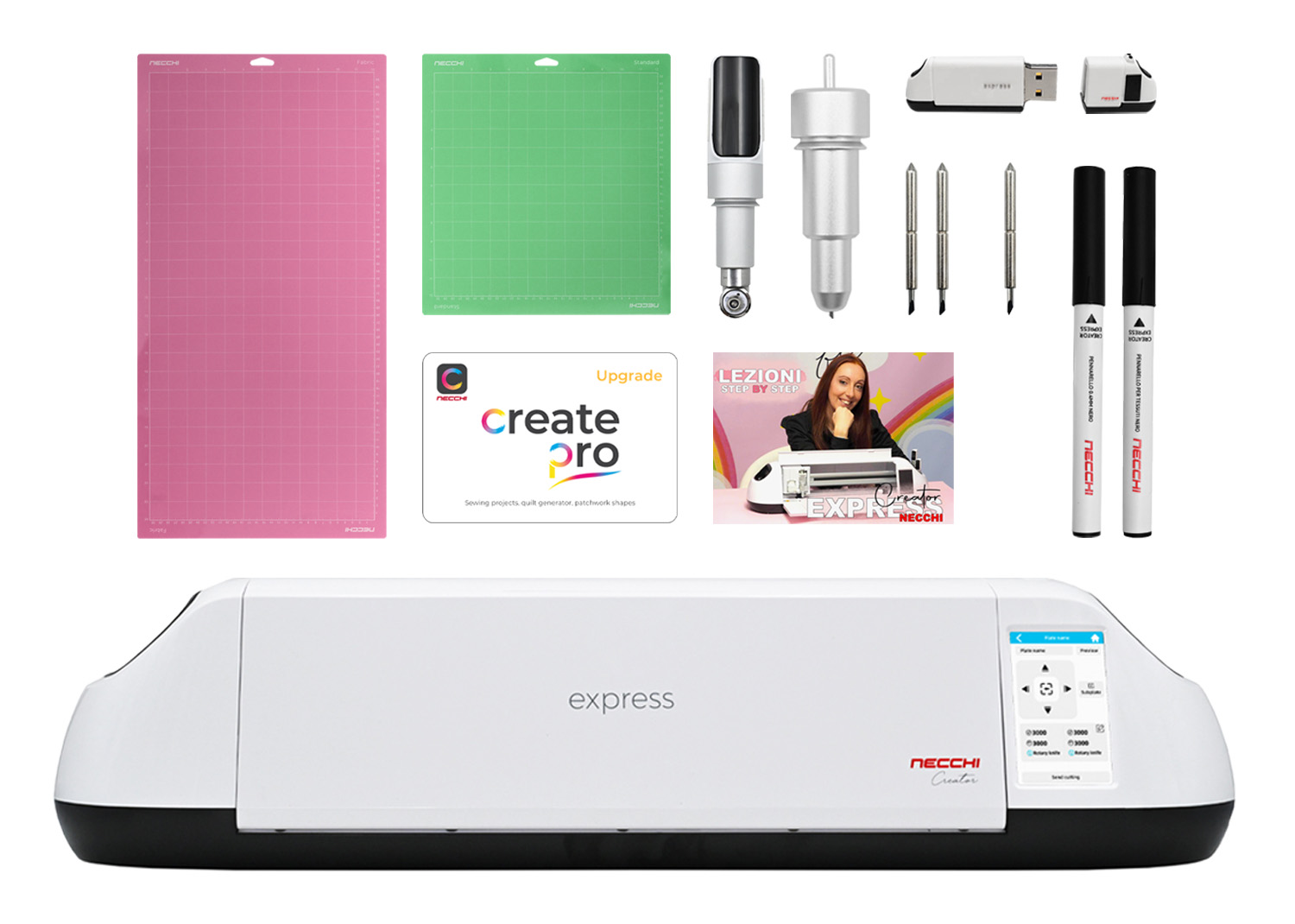 Bundle Necchi Creator Express + CreatePRO: plotter Creator Express con software CreatePRO (1.500+ progetti), lama, pennarello e tappetino. Perfetto per cucito creativo e patchwork.
