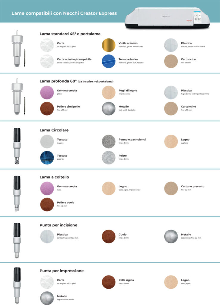 Elegante, potente e semplice da usare: Necchi Creator Express è il plotter da taglio veloce come un treno espresso, progettato per chi vuole libertà, precisione e risultati professionali in ogni progetto creativo. Con una larghezza di taglio fino a 301 mm per progetti su tappetino, e una forza di 4200 g, Creator Express gestisce materiali diversi con facilità, dalla carta alla pelle, dal tessuto al legno di tiglio, dal feltro alla gomma crepla, offrendo prestazioni elevate senza complicazioni.