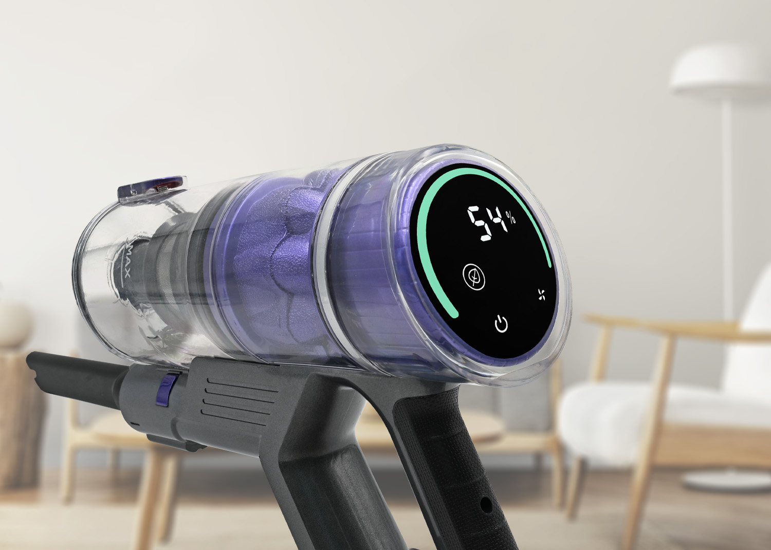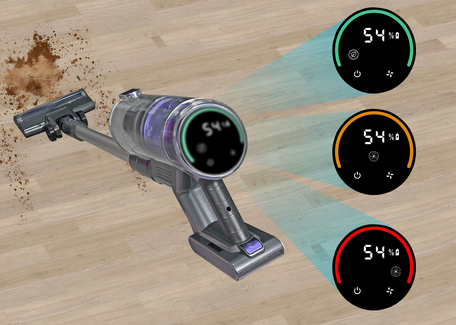Il motore DC da 22,2 Volt con potenza di 140 Watt garantisce una buona capacità di aspirazione, con una potenza fino a 9 kPa, ideale per la rimozione di polvere e sporco da pavimenti duri, tappeti e superfici domestiche. I tre livelli di potenza regolabili – Low, Normal e Turbo – permettono di adattare le prestazioni alle diverse esigenze di pulizia, ottimizzando al tempo stesso il consumo della batteria.