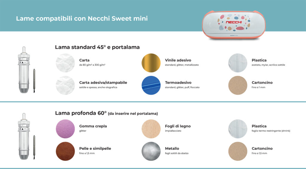 La connettività USB o via cavo permette di lavorare in modo flessibile da computer o dispositivi mobili. Necchi Sweet Mini taglia con lama a 45° e 60°: questa caratteristica la rende adatta a tantissimi materiali, anche mediamente spessi; inoltre, si trasforma in uno strumento creativo completo grazie alla possibilità di disegnare con pennarello ed è dotato della funzione Recut, che consente di ripetere l’ultimo taglio reinviare il progetto dal programma, ottimizzando i flussi di lavoro.