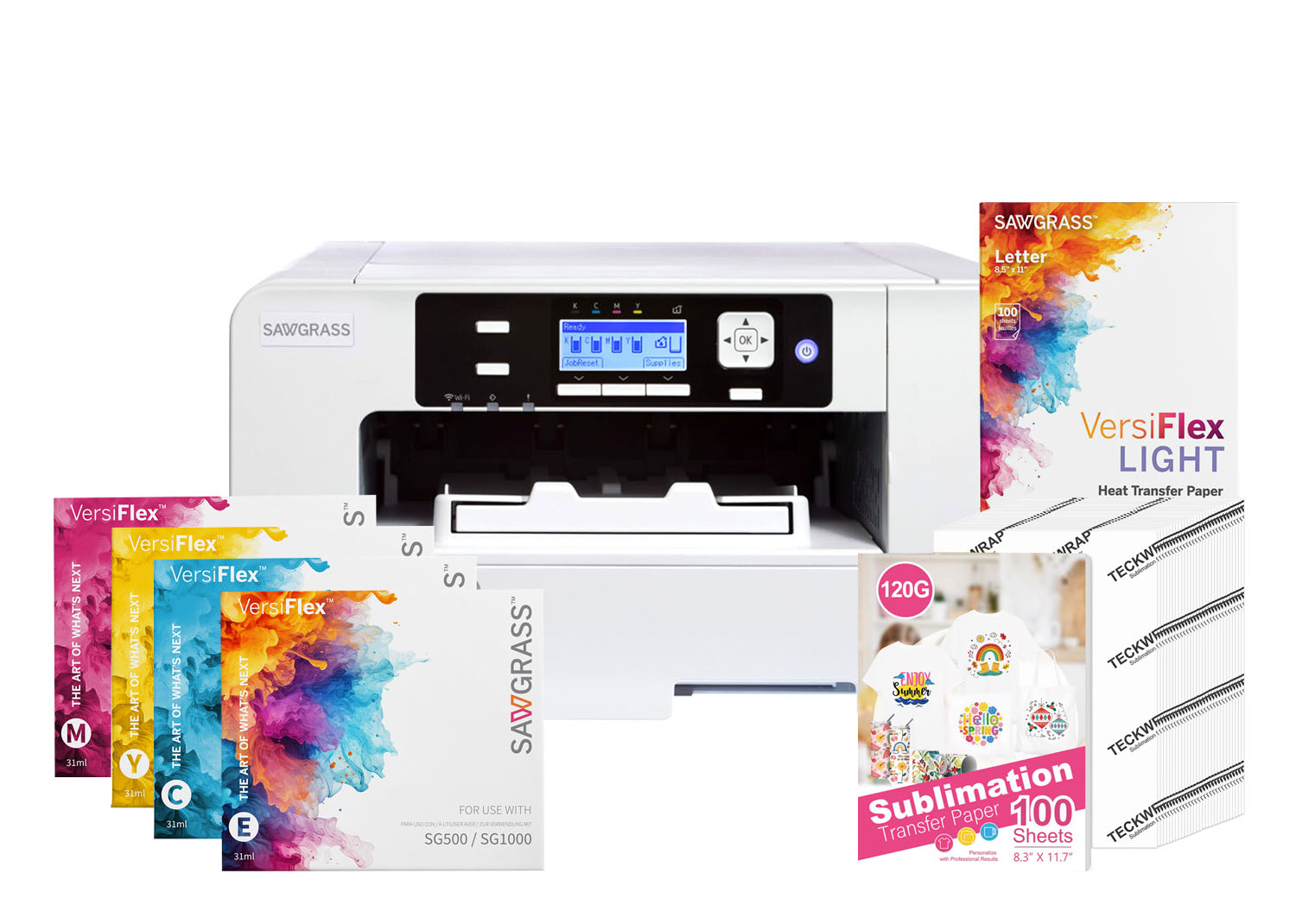 Sawgrass Stampante Sublimatica SG500 A4 con 4 Cartucce 31ml inchiostri VersiFlex + Carta Versiflex Light A5 e Carta per Sublimazione