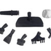 Accessori per 10 funzioni: Serbatoio detergente, 2 panni in microfibra, Slitta per tappeti, Tubo flessibile + spazzola divani, Beccuccio a 90° Tubo flessibile + spazzola vetri, Raschietto, Spazzola rotonda grande, Spazzola rotonda piccola, Spazzola per fughe.